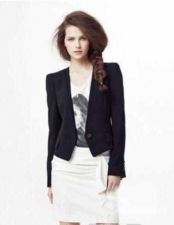 墨蓝的小西装线条简洁,剪裁鲜明,肩部的延展设计还起到修饰的作用。打底和下身都是对比强烈的白色,下身的西装裙令美好线条若隐若现,飘带的设计和内搭的人像T恤更是共同弱化了西装的正式感,是一身非常有范的OL打扮。