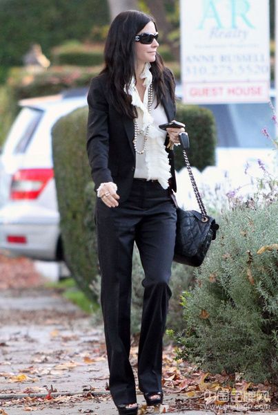 Courteney Cox这身打扮就很有名媛的气度了,带有荷叶边设计的白衬衫很有宫廷装的华丽感,配上简单的黑色西服套装和金属链条包,立刻焕发出奢华的光彩。