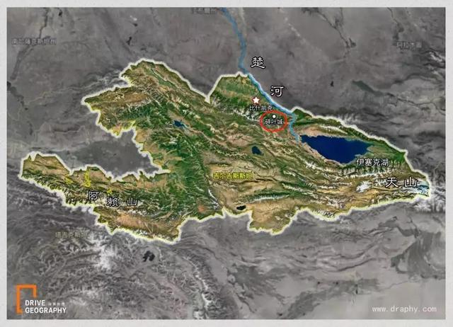吉尔吉斯斯坦国土范围图,红圈位置就是碎叶城,图by《中国自驾地理》